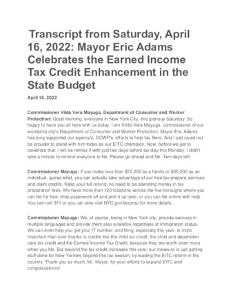 Transcript from Saturday, April 16, 2022: Mayor Eric Adams Celebrates the Earned Income Tax Credit Enhancement in the State Budget
