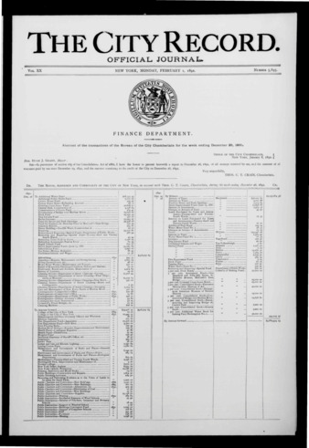 The City Record newspaper publishes notices which includes but is not limited to: public hearings and meetings, public auctions and sales, solicitations and awards and official rules proposed and adopted by city agencies. This is the City Record Newspaper for February 01, 1892.