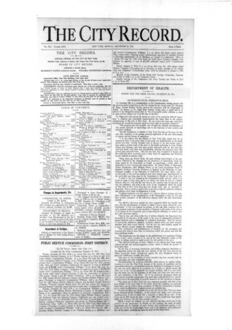 The City Record newspaper publishes notices which includes but is not limited to: public hearings and meetings, public auctions and sales, solicitations and awards and official rules proposed and adopted by city agencies. This is the City Record Newspaper for December 29, 1913.