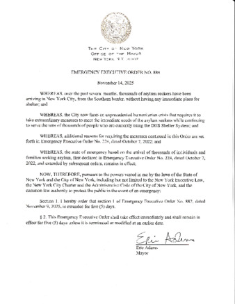 Emergency Executive Order No. 884, is being submitted to extend Emergency Executive Order No. 882, dated November 9, 2025; for five (5) days as it relates to the state of emergency based on the arrival of thousands of individuals and families seeking asylum.
