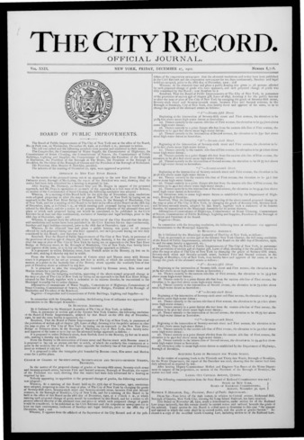 The City Record newspaper publishes notices which includes but is not limited to: public hearings and meetings, public auctions and sales, solicitations and awards and official rules proposed and adopted by city agencies. This is the City Record Newspaper for December 27, 1901.