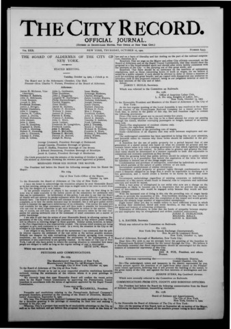 The City Record newspaper publishes notices which includes but is not limited to: public hearings and meetings, public auctions and sales, solicitations and awards and official rules proposed and adopted by city agencies. This is the City Record Newspaper for October 16, 1902.