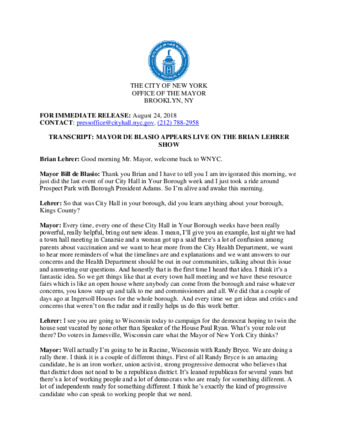 Press Release: TRANSCRIPT: MAYOR DE BLASIO APPEARS LIVE ON THE BRIAN LEHRER SHOW