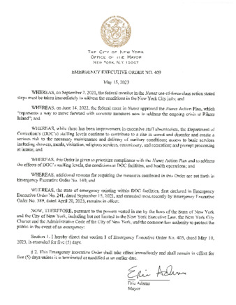 Emergency Executive Order No. 409 is being submitted to extend Emergency Executive Order No. 405, dated May 10, 2023, for five (5) days, if this relates to Rikers.
