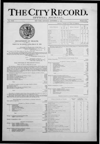 The City Record newspaper publishes notices which includes but is not limited to: public hearings and meetings, public auctions and sales, solicitations and awards and official rules proposed and adopted by city agencies. This is the City Record Newspaper for September 21, 1901.