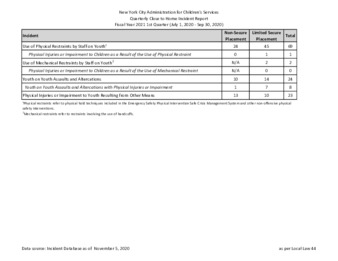 In compliance with Local Law 44 of 2013 passed by the New York City Council, ACS posts quarterly and annual Incident Reports for Detention, Non-Secure Placement and Limited Secur