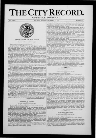 The City Record newspaper publishes notices which includes but is not limited to: public hearings and meetings, public auctions and sales, solicitations and awards and official rules proposed and adopted by city agencies. This is the City Record Newspaper for September 11, 1900.