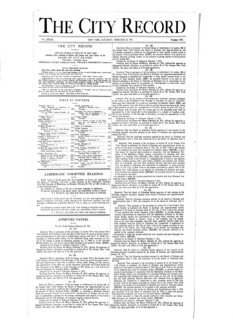 The City Record newspaper publishes notices which includes but is not limited to: public hearings and meetings, public auctions and sales, solicitations and awards and official rules proposed and adopted by city agencies. This is the City Record Newspaper for February 25, 1911.