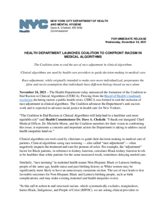 The New York City Department of Health and Mental Hygiene published this press release titled, "Health Department Launches Coalition to Confront Racism in Medical Algorithms", on November 24, 2021.