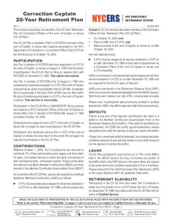 This brochure describes the benefits of the 20-Year Retirement Plan for Correction Officers of the rank of Captain or above (CC-20 Plan). This plan is available only to NYCERS members who became employed by the NYC DOC in a Correction Officer title prior to October 19, 2004.