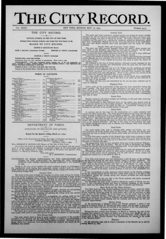 The City Record newspaper publishes notices which includes but is not limited to: public hearings and meetings, public auctions and sales, solicitations and awards and official rules proposed and adopted by city agencies. This is the City Record Newspaper for May 16, 1904.