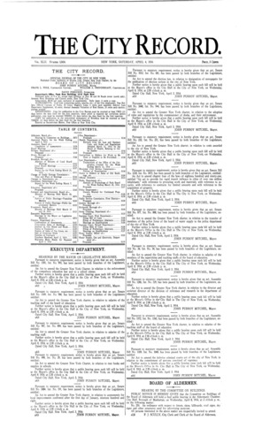The City Record newspaper publishes notices which includes but is not limited to: public hearings and meetings, public auctions and sales, solicitations and awards and official rules proposed and adopted by city agencies. This is the City Record Newspaper for April 04, 1914.