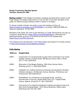 The Public Design Commission meets once a month. The meeting agendas are posted online three business days in advance of each meeting and published in the City Record. Agendas are also distributed to all City Council members, Community Boards, and City agency liaisons.