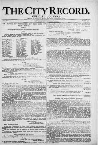 The City Record newspaper publishes notices which includes but is not limited to: public hearings and meetings, public auctions and sales, solicitations and awards and official rules proposed and adopted by city agencies. This is the City Record Newspaper for August 22, 1902.