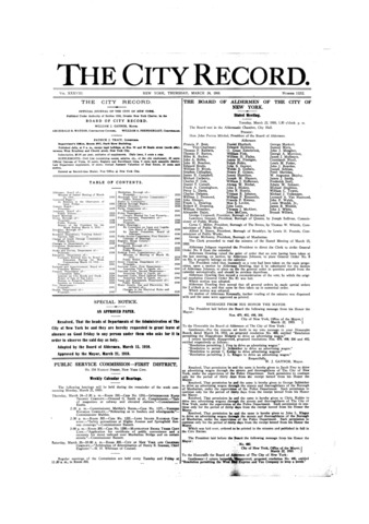The City Record newspaper publishes notices which includes but is not limited to: public hearings and meetings, public auctions and sales, solicitations and awards and official rules proposed and adopted by city agencies. This is the City Record Newspaper for March 24, 1910.