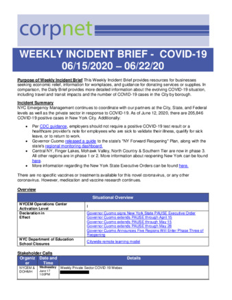 NYCEM CorpNet COVID-19 Weekly Incident Briefs – June 2020