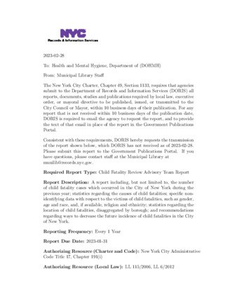 A report including, but not limited to, the number of child fatality cases which occurred in the City of New York during the previous year; statistics regarding the causes of child fatalities; specific non-identifying data with respect to the victims of child fatalities, such as gender, age and race, and, if available, religion and ethnicity; statistics regarding the location of child fatalities, disaggregated by borough; and recommendations regarding ways to decrease the future incidence of child fatalities in the City of New York.