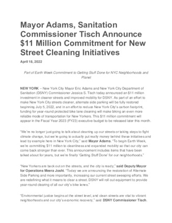 Mayor Adams, Sanitation Commissioner Tisch Announce $11 Million Commitment for New Street Cleaning Initiatives