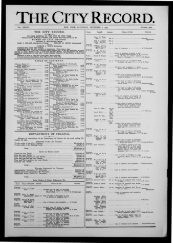 The City Record newspaper publishes notices which includes but is not limited to: public hearings and meetings, public auctions and sales, solicitations and awards and official rules proposed and adopted by city agencies. This is the City Record Newspaper for December 02, 1905.