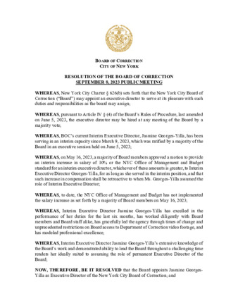NOW, THEREFORE, BE IT RESOLVED that the Board appoints Jasmine GeorgesYilla as Executive Director of the New York City Board of Correction; and IT IS FURTHER RESOLVED that incoming Executive Director Georges-Yilla shall be provided an increase of compensation reflecting her appointment as Executive