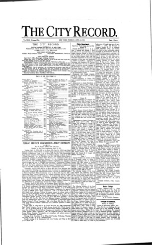 The City Record newspaper publishes notices which includes but is not limited to: public hearings and meetings, public auctions and sales, solicitations and awards and official rules proposed and adopted by city agencies. This is the City Record Newspaper for April 12, 1915 with supplement.