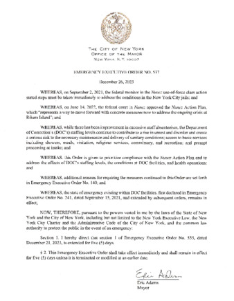 Emergency Executive Order No. 537, is being submitted to extend Emergency Executive Order No. 535, dated December 21, 2023, for five (5) days if this relates to Rikers.