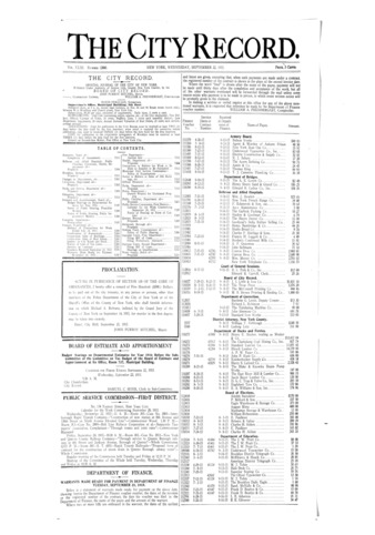 The City Record newspaper publishes notices which includes but is not limited to: public hearings and meetings, public auctions and sales, solicitations and awards and official rules proposed and adopted by city agencies. This is the City Record Newspaper for September 22, 1915.