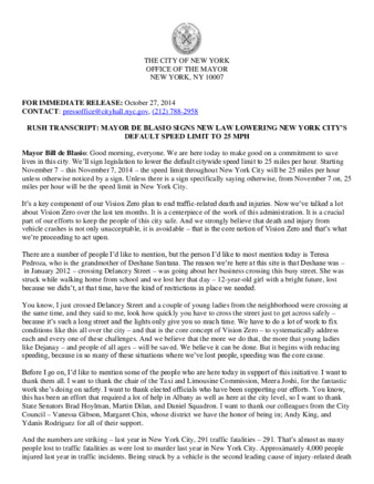 Mayor's Press Release: MAYOR DE BLASIO SIGNS NEW LAW LOWERING NEW YORK CITY’S DEFAULT SPEED LIMIT TO 25 MPH