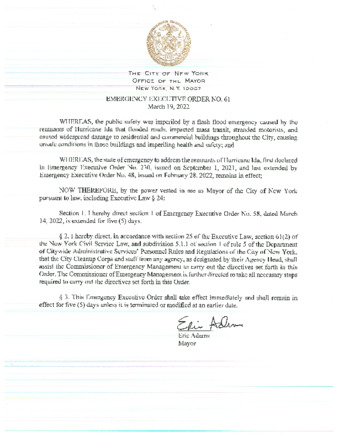 Emergency Executive Order No. 61 extends Emergency Executive Order No. 58, dated March 14, 2022, by 5 days. It relates to the City's response to Hurricane Ida.
