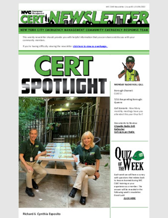 New York City Emergency Management is responsible for the NYC Community Emergency Response Team (CERT) program and distributes this weekly CERT newsletter to all active members so that they stay up-to-date on new opportunities, policies and initiatives that affect their membership.