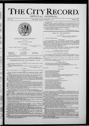 The City Record newspaper publishes notices which includes but is not limited to: public hearings and meetings, public auctions and sales, solicitations and awards and official rules proposed and adopted by city agencies. This is the City Record Newspaper for December 05, 1879.