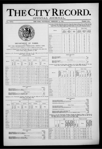 The City Record newspaper publishes notices which includes but is not limited to: public hearings and meetings, public auctions and sales, solicitations and awards and official rules proposed and adopted by city agencies. This is the City Record Newspaper for February 15, 1899.