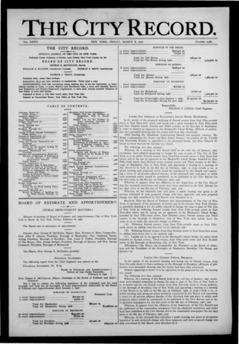 The City Record newspaper publishes notices which includes but is not limited to: public hearings and meetings, public auctions and sales, solicitations and awards and official rules proposed and adopted by city agencies. This is the City Record Newspaper for March 08, 1907.