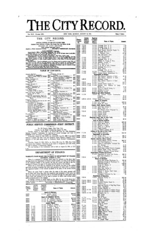 The City Record newspaper publishes notices which includes but is not limited to: public hearings and meetings, public auctions and sales, solicitations and awards and official rules proposed and adopted by city agencies. This is the City Record Newspaper for August 10, 1914.