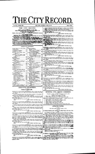 The City Record newspaper publishes notices which includes but is not limited to: public hearings and meetings, public auctions and sales, solicitations and awards and official rules proposed and adopted by city agencies. This is the City Record Newspaper for April 10, 1915.