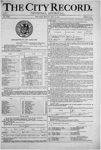 The City Record newspaper publishes notices which includes but is not limited to: public hearings and meetings, public auctions and sales, solicitations and awards and official rules proposed and adopted by city agencies. This is the City Record Newspaper for May 20, 1901.