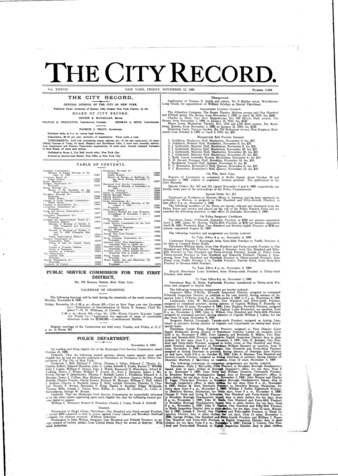 The City Record newspaper publishes notices which includes but is not limited to: public hearings and meetings, public auctions and sales, solicitations and awards and official rules proposed and adopted by city agencies. This is the City Record Newspaper for November 12, 1909.
