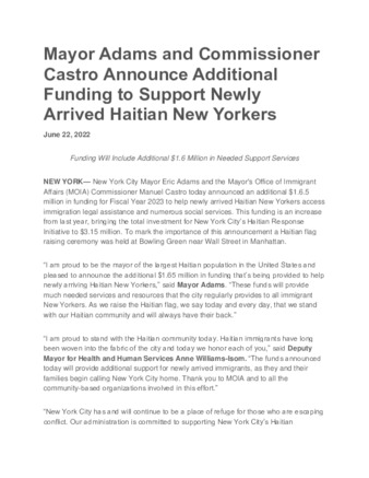 New York City Mayor Eric Adams and the Mayor's Office of Immigrant Affairs (MOIA) Commissioner Manuel Castro announces an additional $1.6.5 million in funding for Fiscal Year 2023 to help newly arrived Haitian New Yorkers access immigration legal assistance.