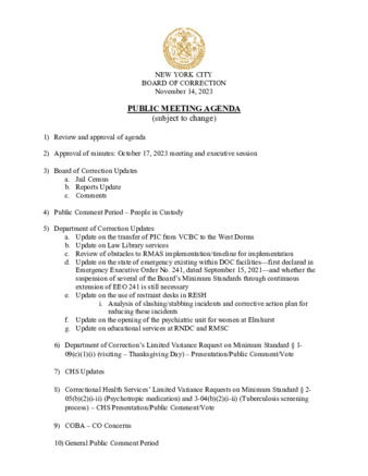 1) Review and approval of agenda 2) Approval of minutes: October 17, 2023 meeting and executive session 3) Board of Correction Updates 4) Public Comment Period – People in Custody 5) Department of Correction Updates6) Department of Correction’s Limited Variance Request on Minimum Standard § 1- 09(c)