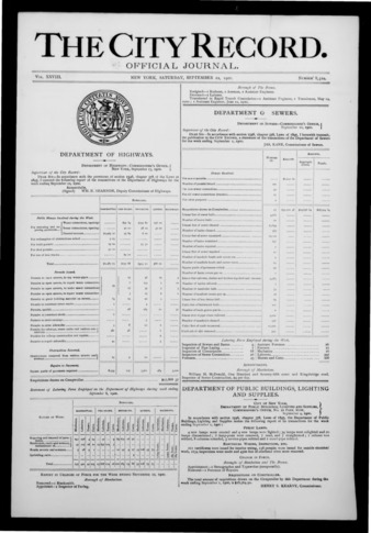 The City Record newspaper publishes notices which includes but is not limited to: public hearings and meetings, public auctions and sales, solicitations and awards and official rules proposed and adopted by city agencies. This is the City Record Newspaper for September 22, 1900.