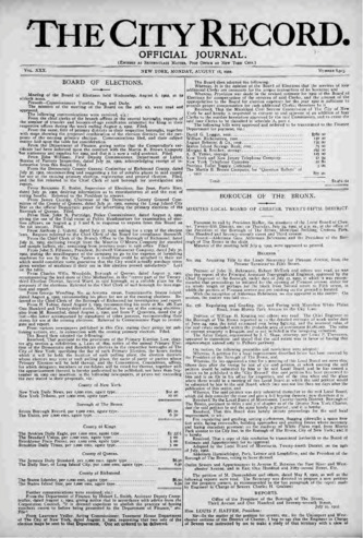 The City Record newspaper publishes notices which includes but is not limited to: public hearings and meetings, public auctions and sales, solicitations and awards and official rules proposed and adopted by city agencies. This is the City Record Newspaper for August 18, 1902.