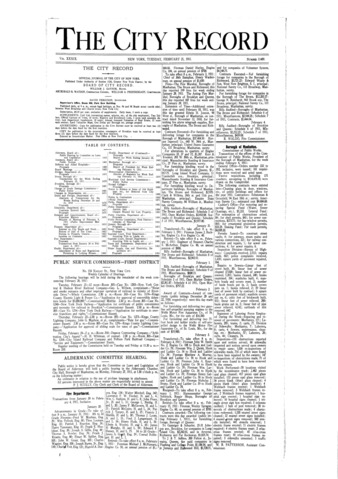 The City Record newspaper publishes notices which includes but is not limited to: public hearings and meetings, public auctions and sales, solicitations and awards and official rules proposed and adopted by city agencies. This is the City Record Newspaper for February 21, 1911.