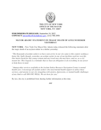 New York City Mayor Eric Adams releases a statement after the tragic death of an asylum seeker in a shelter yesterday.