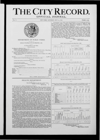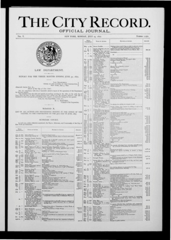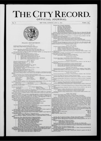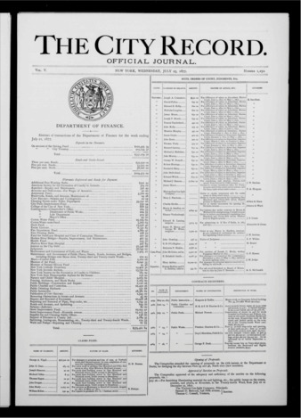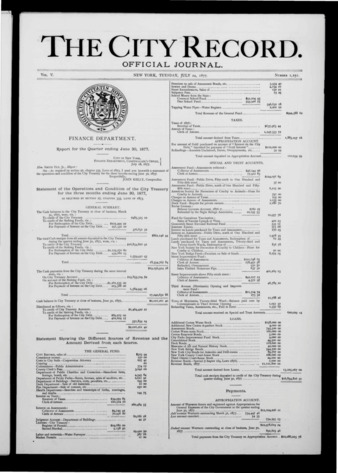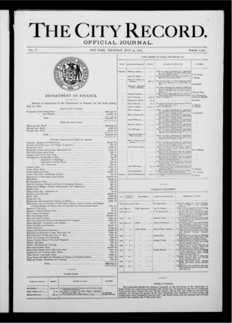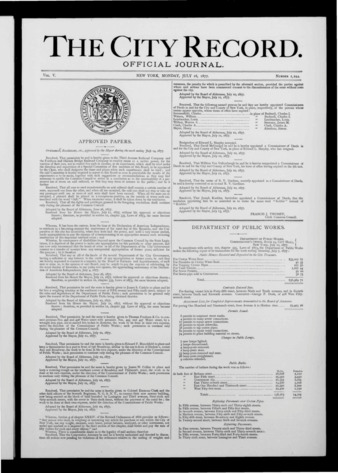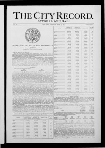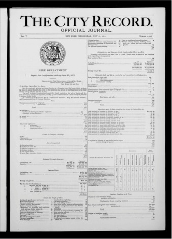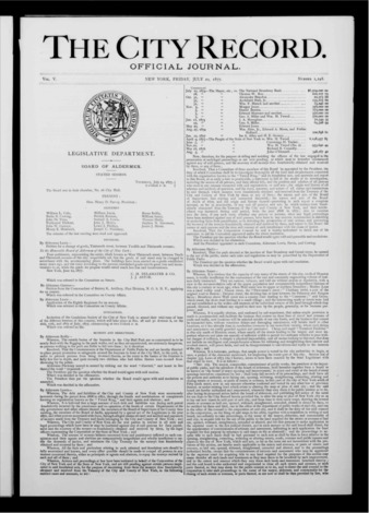 The City Record newspaper publishes notices which includes but is not limited to: public hearings and meetings, public auctions and sales, solicitations and awards and official rules proposed and adopted by city agencies. This is the City Record Newspapers for July 1877.