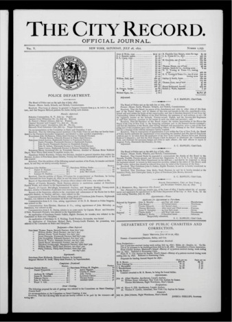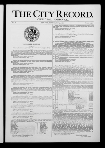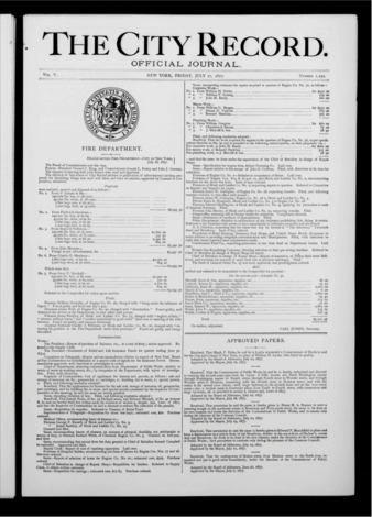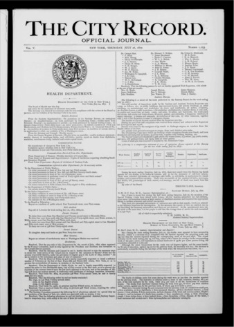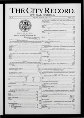 The City Record newspaper publishes notices which includes but is not limited to: public hearings and meetings, public auctions and sales, solicitations and awards and official rules proposed and adopted by city agencies. This is the City Record Newspapers for July 1877.