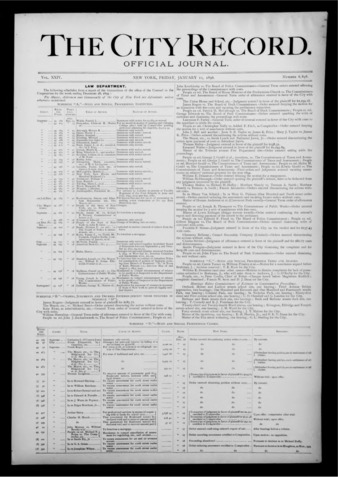 The City Record newspaper publishes notices which includes but is not limited to: public hearings and meetings, public auctions and sales, solicitations and awards and official rules proposed and adopted by city agencies. This is the City Record Newspaper for January 10, 1896.