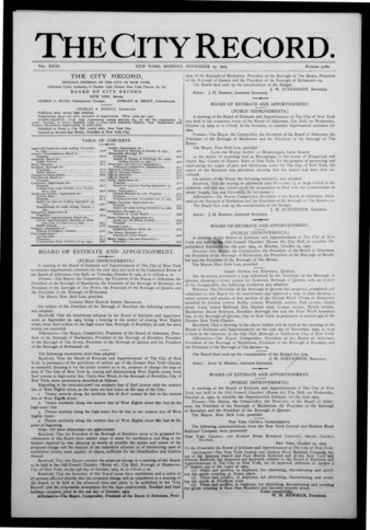 The City Record newspaper publishes notices which includes but is not limited to: public hearings and meetings, public auctions and sales, solicitations and awards and official rules proposed and adopted by city agencies. This is the City Record Newspaper for November 23, 1903.