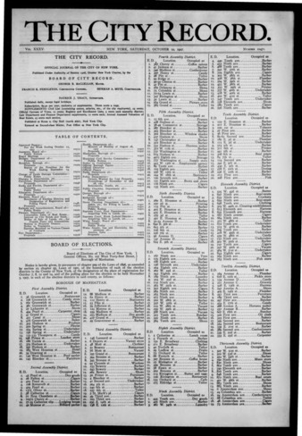 The City Record newspaper publishes notices which includes but is not limited to: public hearings and meetings, public auctions and sales, solicitations and awards and official rules proposed and adopted by city agencies. This is the City Record Newspaper for October 12, 1907.