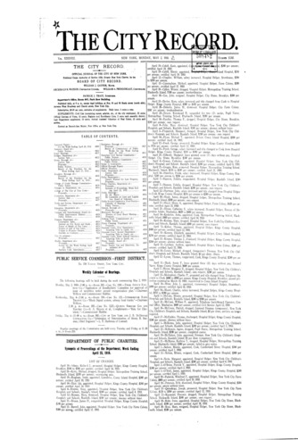 The City Record newspaper publishes notices which includes but is not limited to: public hearings and meetings, public auctions and sales, solicitations and awards and official rules proposed and adopted by city agencies. This is the City Record Newspaper for May 02, 1910.