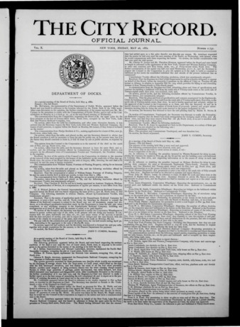 The City Record newspaper publishes notices which includes but is not limited to: public hearings and meetings, public auctions and sales, solicitations and awards and official rules proposed and adopted by city agencies. This is the City Record Newspaper for May 26, 1882.